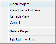 You can Open Project, View Image Full Size, Refresh View, Cancel, Delete Project, or Exit Build-A-Board.