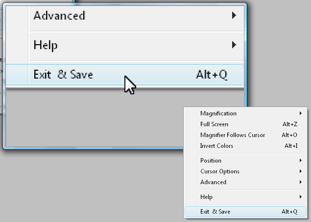 Exit & Save This option will allow you to exit The Magnifier and save the personal settings you have set up while using the product. Keyboard Shortcut: Alt-Q