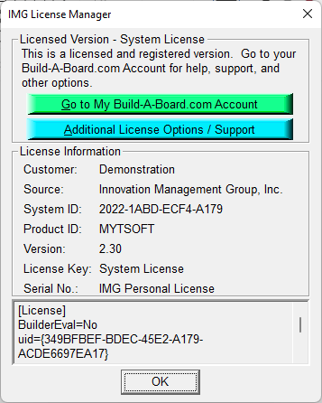 When properly Licensed with an IMG Personal License, a screen similar to this will show the License Information for the product. This display indicates that the software is Licensed. For help, support, and other options, you can click on the "Go to My Build-A-Board.com Account" to open a browser and access your account online.