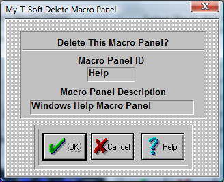 Use with extreme caution. Once the panel is deleted, it cannot be recovered! Press the OK Button to Delete the Selected Macro Panel. If you do not want to delete your panel, press the CANCEL button. |