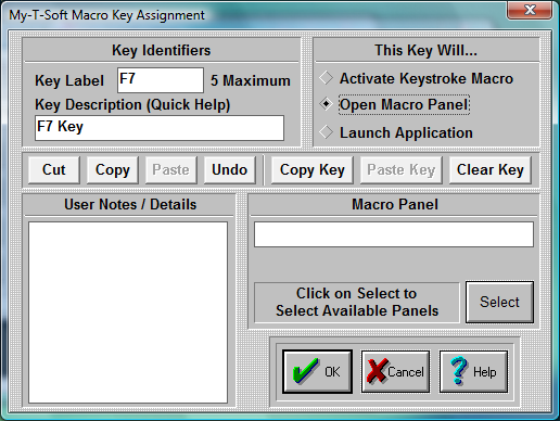 These shortcut keys may be used to manipulate & operate within My-T-Soft TS Setup / Macro Key Editing. For example, you could Copy Key information from an existing panel to be pasted into another Macro Panel.