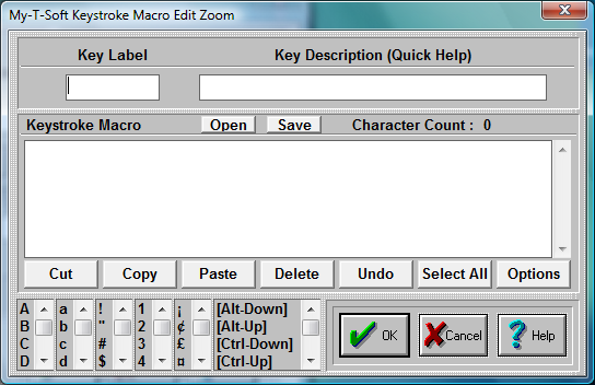 The Open and Save buttons are available as conveniences for developers using the MACROBAT and other IMG utilities. These will use the Zoom Edit screen as an the Editing area - Open will open, read, and place the contents of a previously Saved Macro into the Zoom Edit area. The KMF (Keyboard Macro File) format is used.