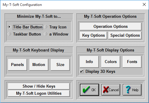 Within Configuration, you will be able to set conditions that influence how My-T-Soft will appear and behave on screen.