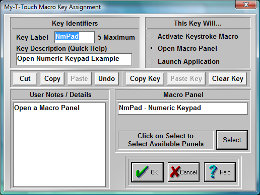 These shortcut keys may be used to manipulate & operate within My-T-Touch Setup / Macro Key Editing. For example, you could Copy Key information from an existing panel to be pasted into another Macro Panel.