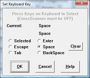 When you select Keyboard Key for use within CrossScanner, you have the ability to select which Keyboard Key will be used. You may click to select Escape, Tab, BackSpace, Space, or Enter. If you wish to use another key, click on Selected, and use your keyboard to enter which key will be used within CrossScanner. Valid keys are F1 through F12, 0 through 9, and A through Z. Make sure CrossScanner is not running when you select the Keyboard Key.