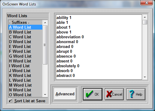 When clicked on, the Advanced button opens up the Word List Assistant which contains several features for maintaining & working with word lists.