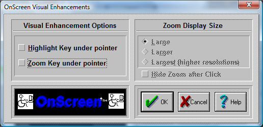 Check On this option to enable a magnification window that expands the key under the mouse pointer (mouse cursor). During OnScreen operation, the window will follow the pointer and magnify the key into the magnification window. The size of the window will change based on the size of the key pointed to, and the Zoom Display Size (see below). This is a visual enhancement that may help some individuals identify the key easier, prior to selection. If a portion of the key is off-screen, the Zoom will not display the magnification window. The position of the window relative to the pointer (cursor) depends on the position of OnScreen, the size of the magnification window, and the screen edges.
