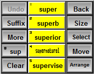 Suffix / Words - This button will take on different meanings based on where the user is regarding completions. If Suffixes are enabled (in User OptionsUser_Options_Dialog_Box ), then Suffix will appear during character typing. Prior to a Completion, the Suffix button may be pressed to display available suffixes. The label will change to Words, to indicate that the completion buttons can be toggled back to the Completion suggestions if no suffix is selected. Note that after a completion (if Suffixes are enabled), then the suffixes will automatically appear.